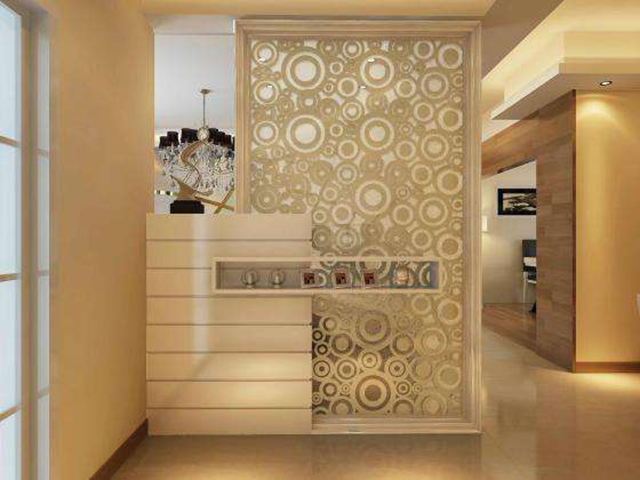 是以隔斷下部為完全遮蔽式設(shè)計(jì)。隔斷兩側(cè)隱蔽無法通透,上端敞開,貫通彼此相連的天花頂棚。半敞半隱式的隔斷墻高度大多為l.5m,通過線條的凹凸變化、墻面掛置壁飾或采用浮雕等裝飾物的布置,從而達(dá)到濃厚的藝術(shù)效果。