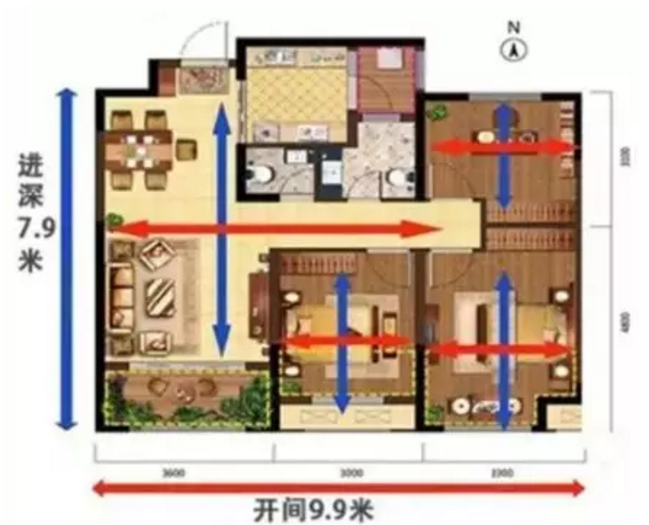 把房子的主要采光面稱為開間(一般指東西的距離),與其垂直的稱為進深(一般指南北的距離)。開間和進深的比例為4:6較為合適,如果開間太小,進深過大,會影響房子的采光,反之則室內溫度,濕度不穩(wěn)。