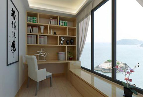 房子面積小,一般都不設(shè)有獨自的書房或工作間,其實稍加改造,調(diào)配全體書櫥、寫字臺、伸縮式吊燈、休閑椅就能將陽臺“裝扮”成一間獨具匠心的雅致書房。既可在此與友人敘談,書寫疲倦時仍是擴展軀體、放松神經(jīng)的氧源豐厚的歇息之地。