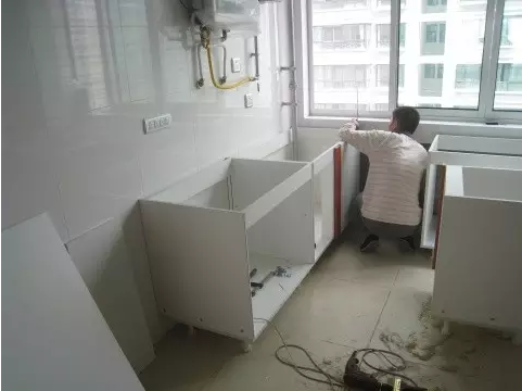 3、進(jìn)行櫥柜、油煙機(jī)等炊具的安裝,水槽(上下水件稍后安裝)和煤氣灶也要跟上,記得通知物業(yè)開通煤氣測(cè)試一下。
