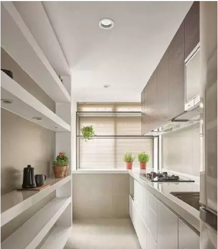 ▲在家也能有餐具展示墻:捨棄封閉柜體,利用大面積開放層架收納兼展示餐瓷,更特別在中間層架裝設(shè)投射燈,運用光線襯托餐瓷的氣勢并營造視覺焦點;善用窗臺空間收納小型家電:利用廚房末端的窗臺空間收納電鍋、烤箱等小家電,可避免壓縮到狹長型廚房的走道空間,透光佳的玻璃鐵架則保留窗臺原有的採光與通透性。