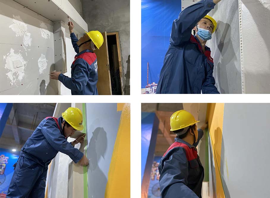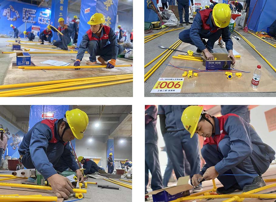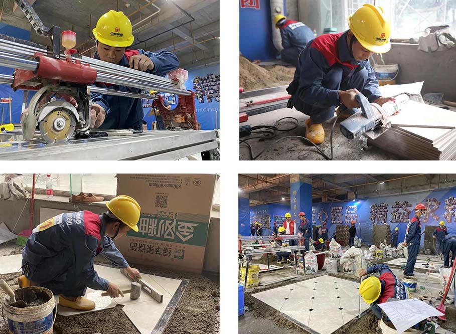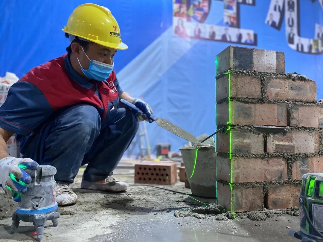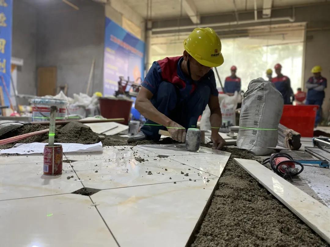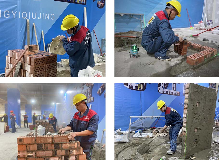 現(xiàn)場(chǎng)一共有土建組、水電組、瓦工組、膩?zhàn)咏M四大工種賽區(qū),參賽選手在相對(duì)應(yīng)的工位,根據(jù)圖紙要求進(jìn)行比賽。