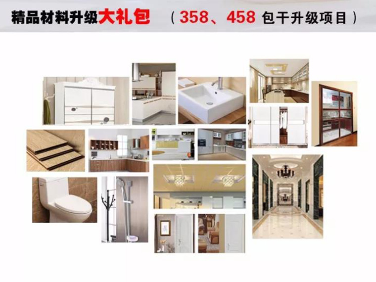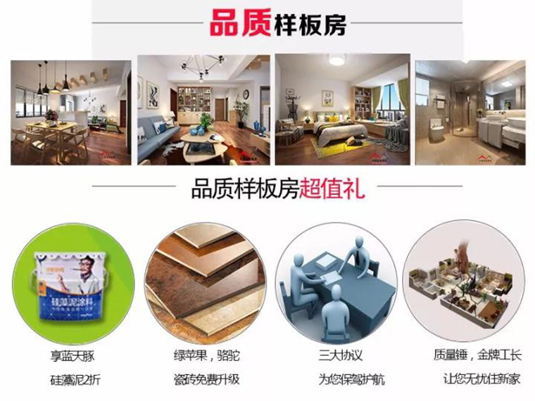 全房精品主材,墻漆,吊頂、瓷磚、木地板、衛(wèi)浴、櫥柜、室內(nèi)門,等免費(fèi)升級,您可以選購到自己心儀的家裝建材,還能享受超級折上折哦!