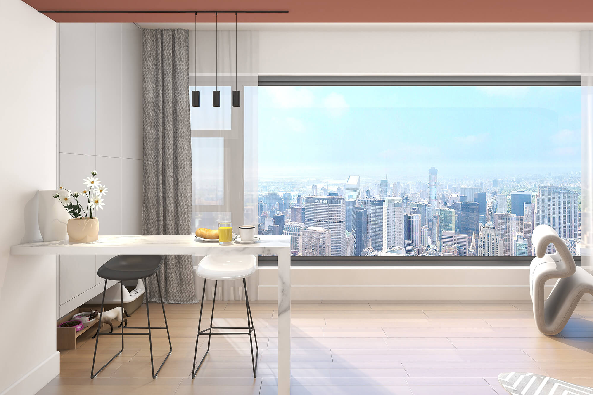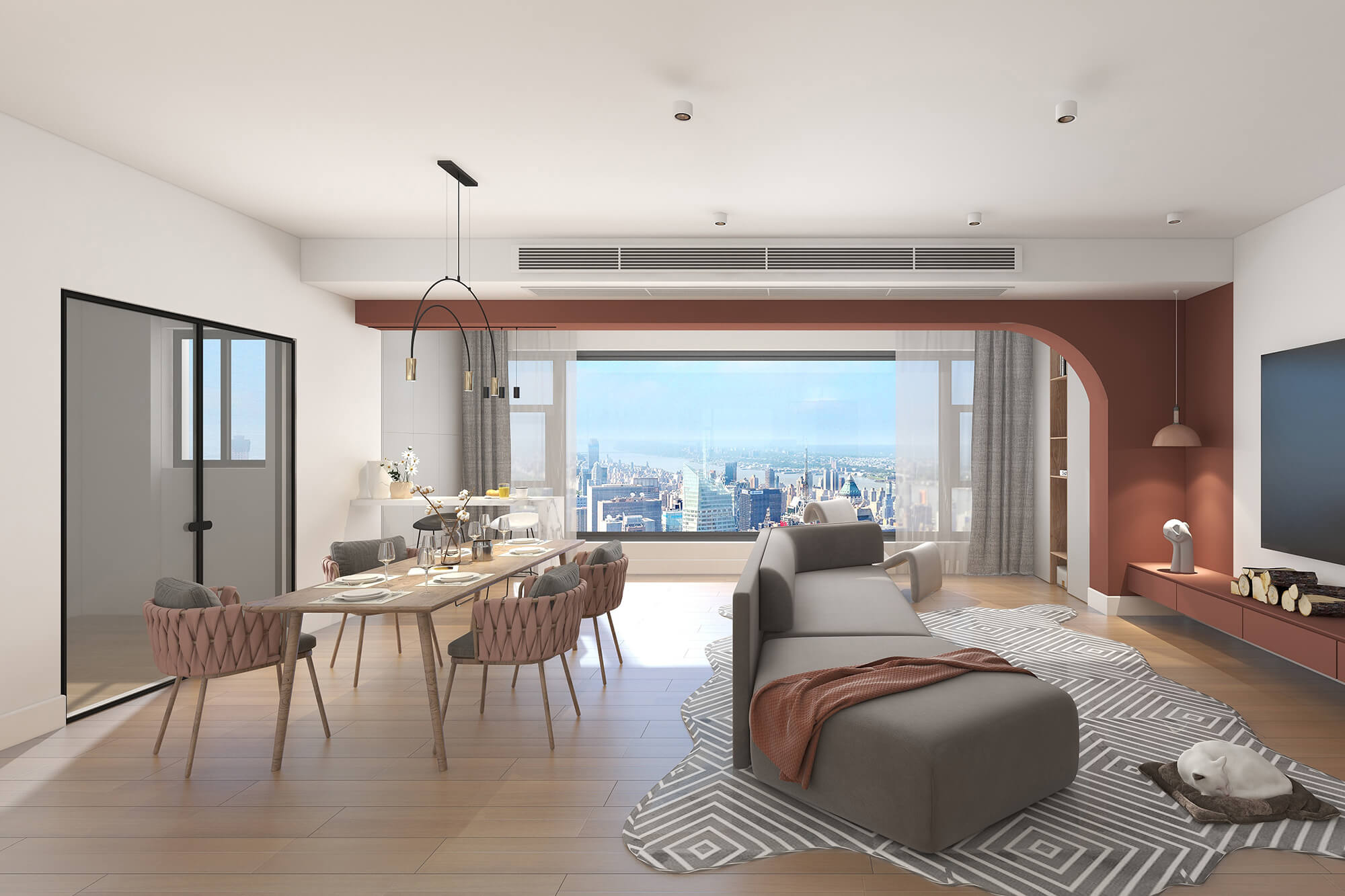 本案設(shè)計師基于人與動物、環(huán)境之間的大融合的考慮,實現(xiàn)了人們想要追求的一種泛空間,家庭不再是以空間而定位,而是以氛圍而定位。比如說男女主人在辦公的時候,可以在客廳、餐廳跟貓咪玩耍,或者在做飯的時候也能夠和外面的人互動,空間既獨立又融合。