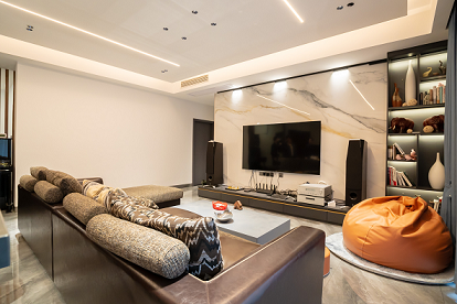 電視背景墻選用木飾面及巖板,質(zhì)感柔和,地面用同色系深色些的瓷磚,讓空間更有層次感。